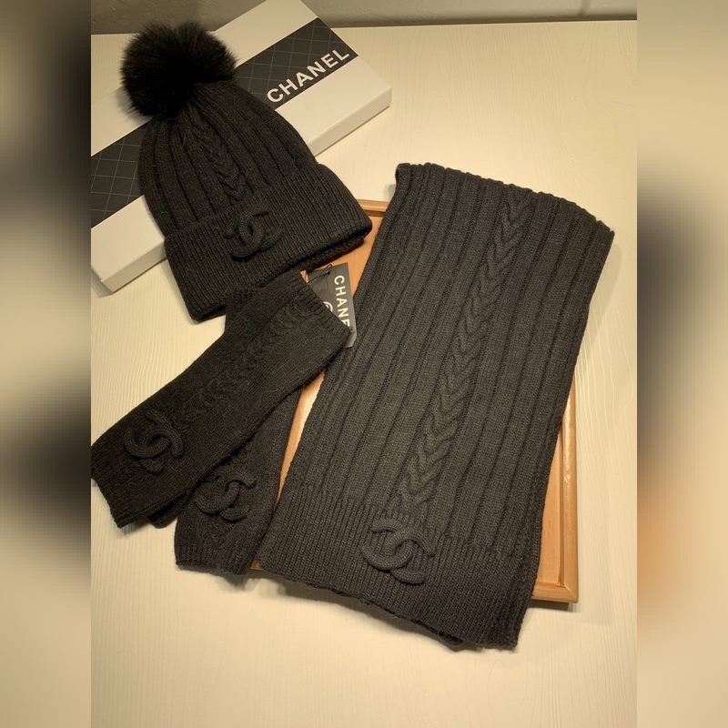 C Family Classic Wool Three-Piece Set Fox Fur Hat Scarf and Gloves Warm&Cozy